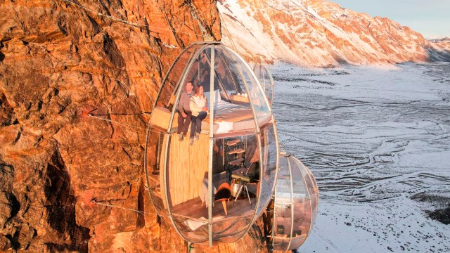 Ubicado frente al imponente Fitz Roy, dentro del área del Parque Nacional Los Glaciares, este complejo ofrece cápsulas suspendidas a 270 metros de altura, adosadas a una pared de roca.