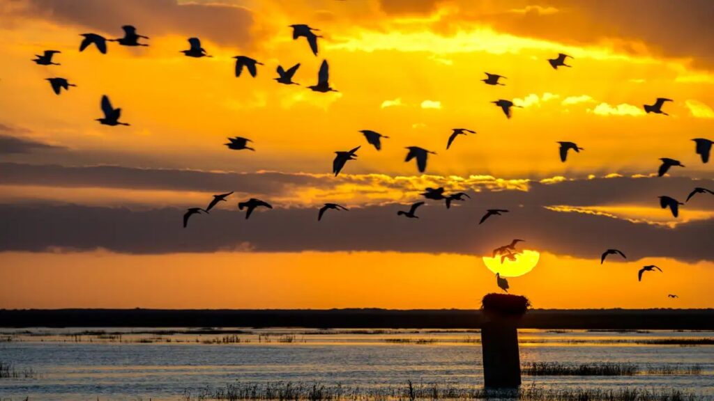 Islas como Saltés o Enmedio, junto a lagunas y canales mareales, conforman un ecosistema dinámico donde conviven especies como flamencos, espátulas, garzas y águilas pescadoras. El silencio, interrumpido únicamente por el sonido de las aves, es parte esencial de la experiencia.