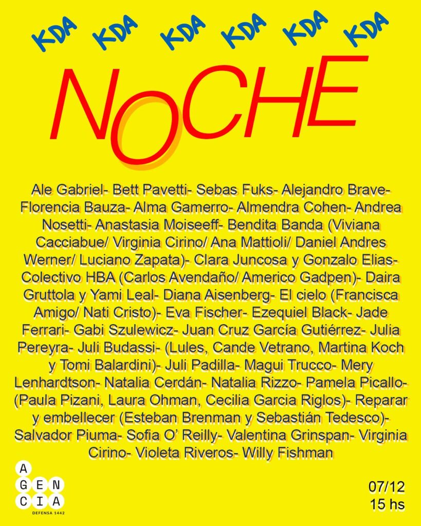 “El centro de operaciones artísticas destinado a la circulación de obras, derivas y procesos poéticos AGENCIA recibe esta vez a KDA Noche, con curaduría de Diana Aisenberg”, así invita este espacio artístico en pleno corazón de San Telmo. La inauguración fue el 7 diciembre pero este espectacular encuentro se extenderá hasta el 8 de enero.