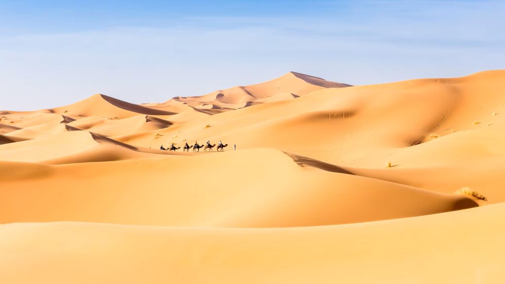 En el borde del desierto del Sáhara, Merzouga ofrece la experiencia única de las dunas de Erg Chebbi. Los visitantes pueden recorrerlas en camello y pasar la noche bajo un cielo estrellado en campamentos beduinos, conectando con la naturaleza de manera íntima.