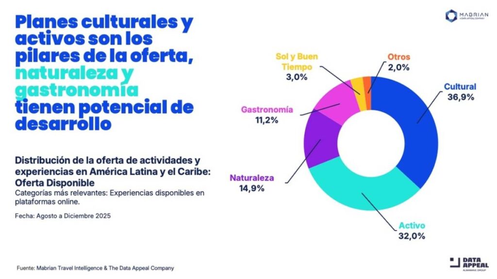 El informe también identifica que las experiencias culturales dominan el mercado con el 36,9 % de la oferta, seguidas por el turismo activo (32 %). Les continúan actividades en la naturaleza (14,9 %), propuestas gastronómicas (11,2 %) y planes vinculados al sol y playa (3 %). En contraste, segmentos como compras, vida nocturna, bienestar y actividades familiares apenas suman el 2 % del total disponible, lo que marca nichos con potencial de desarrollo.